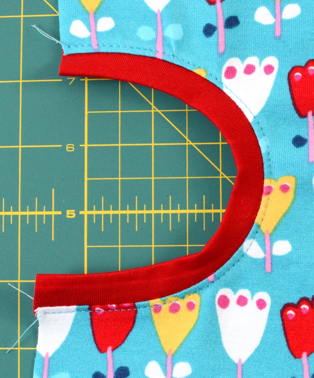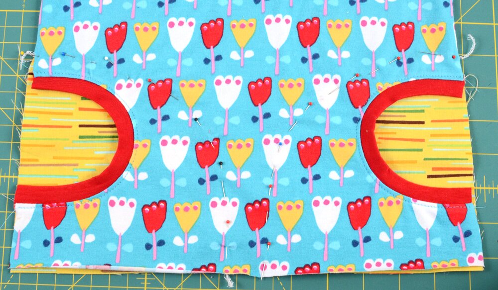 Now, sew the pocket binding onto the front pattern pockets and sew the serged seam flat to the dress.