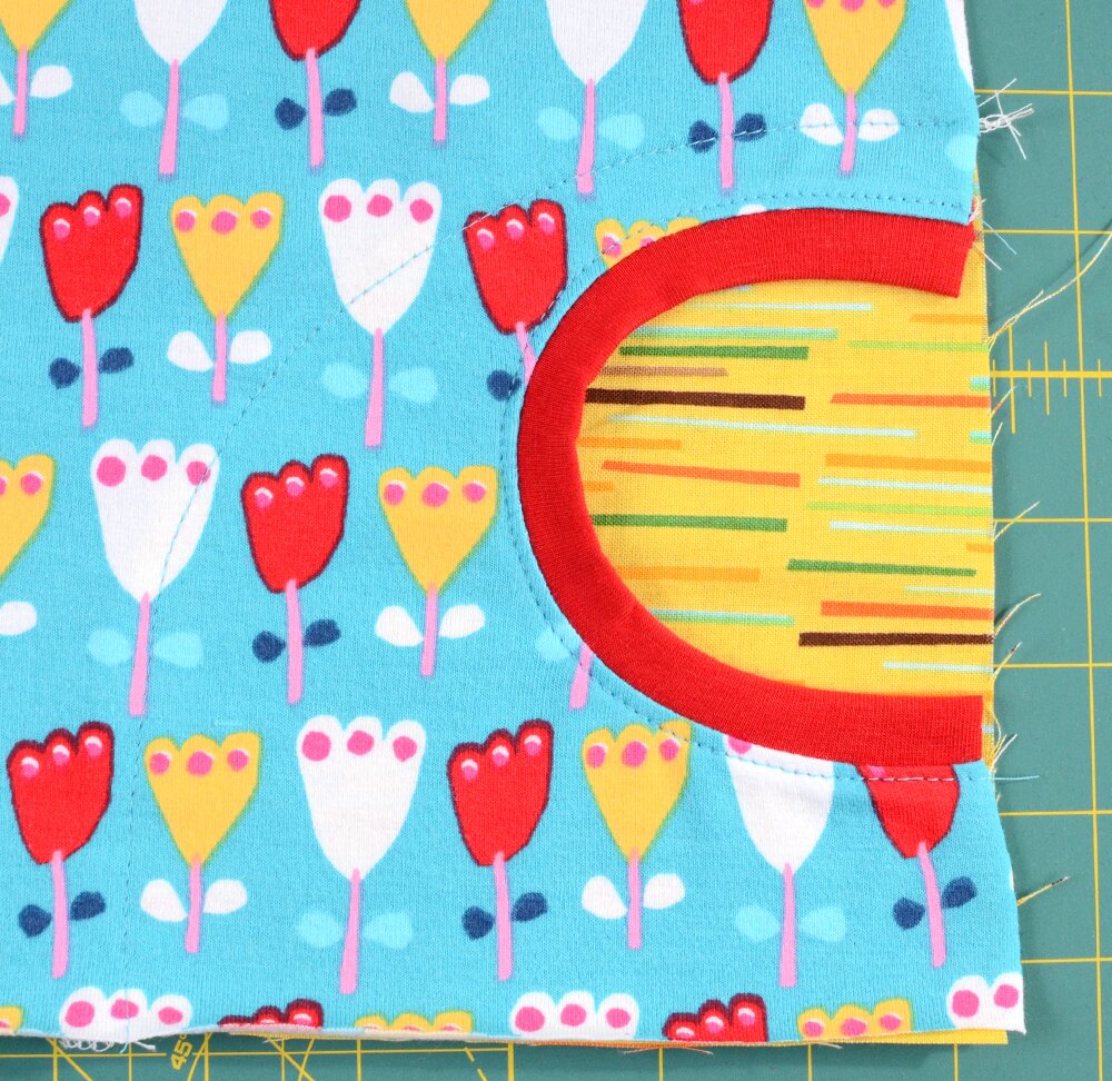 The pockets will get placed so the right side is showing in the pocket. I serged the edges of mine because I used woven cotton, if you are using knit you don’t have to.