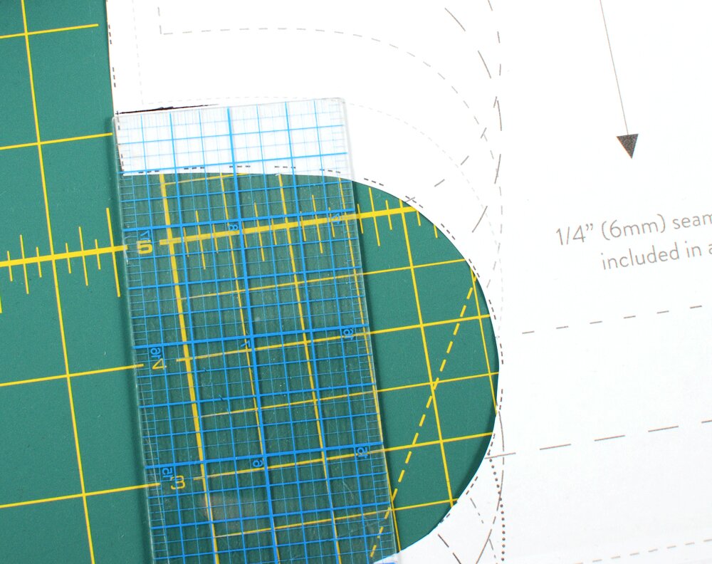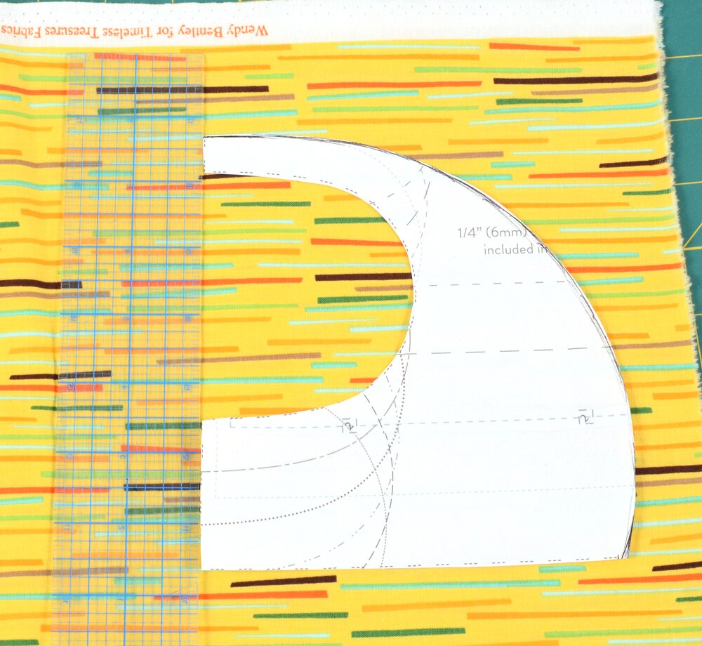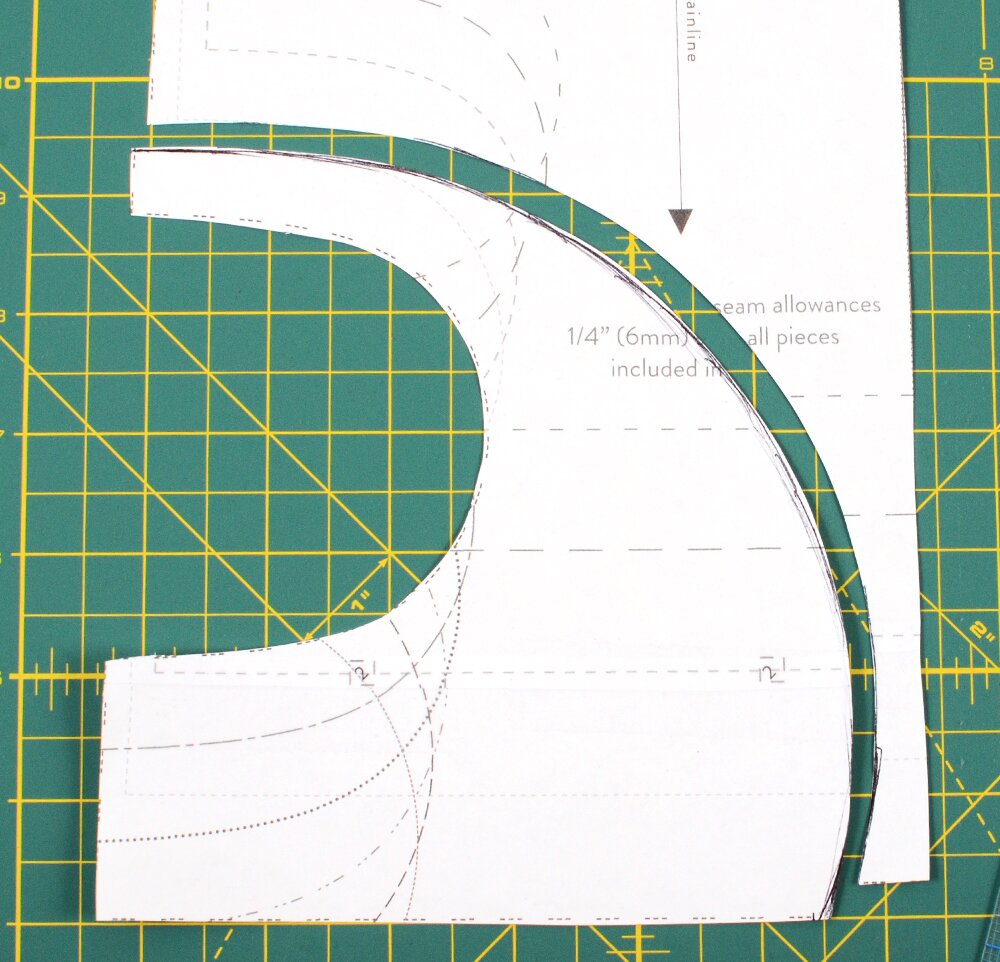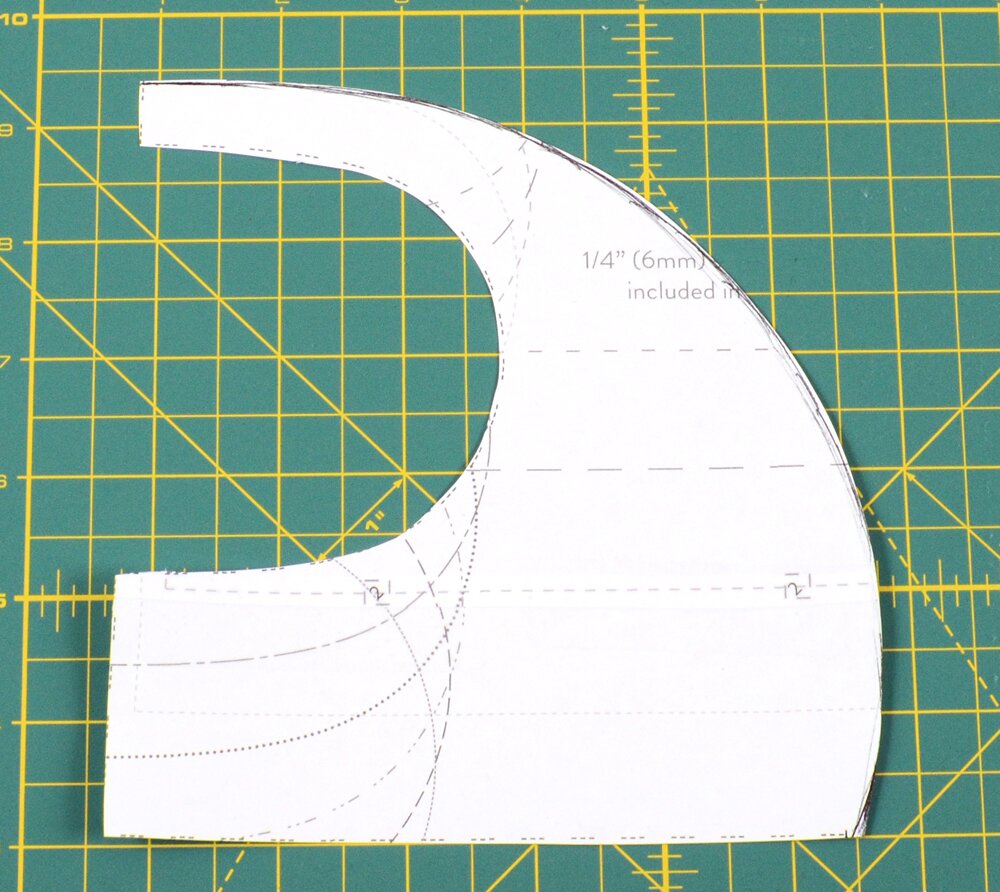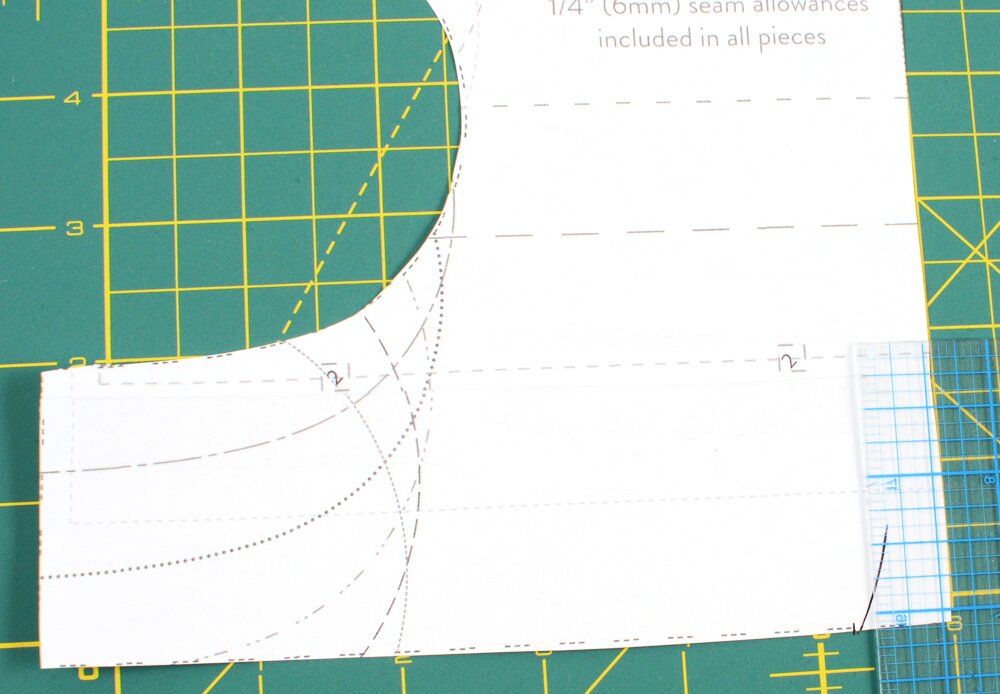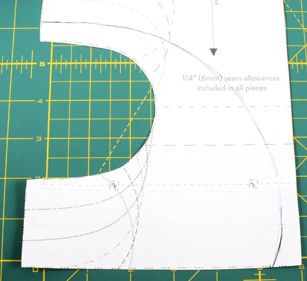 To create new pocket backings, take the front pattern and mark a line about 0.5″ from the top of the pocket arc.