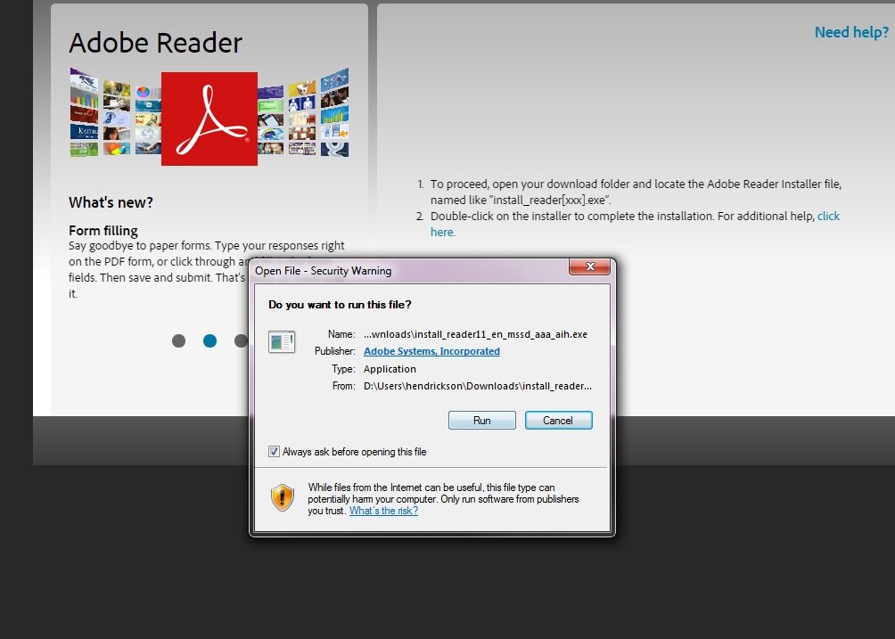 Find the adobe installer just downloaded and double click to continue the install. Choose run if you get this prompt: