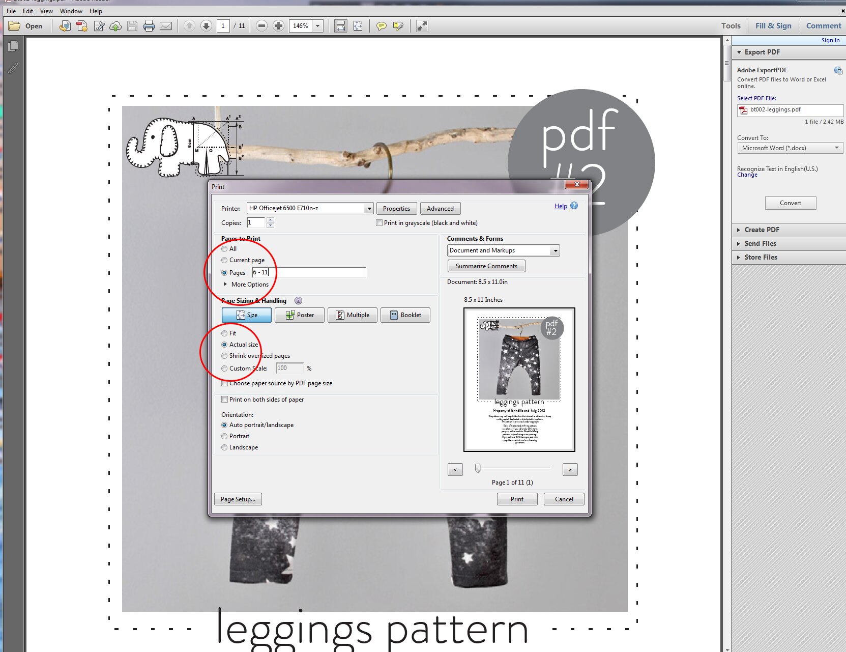 Open your PDF pattern to print. To save paper, you can choose to print only the pattern pages and read from the instruction pages from your screen. In the example below I chose pages 6-11 because those are the pattern pages, and I selected ‘Actual size‘ so it doesn’t scale.