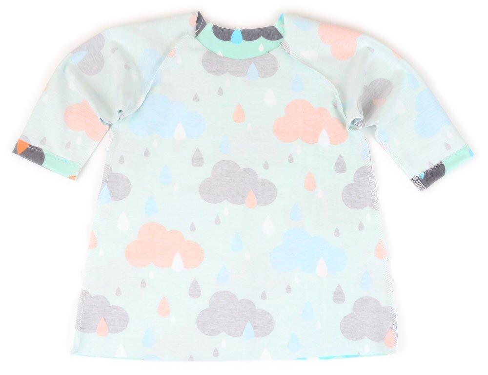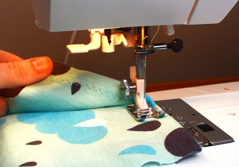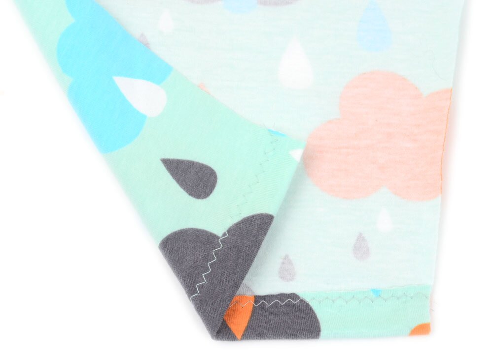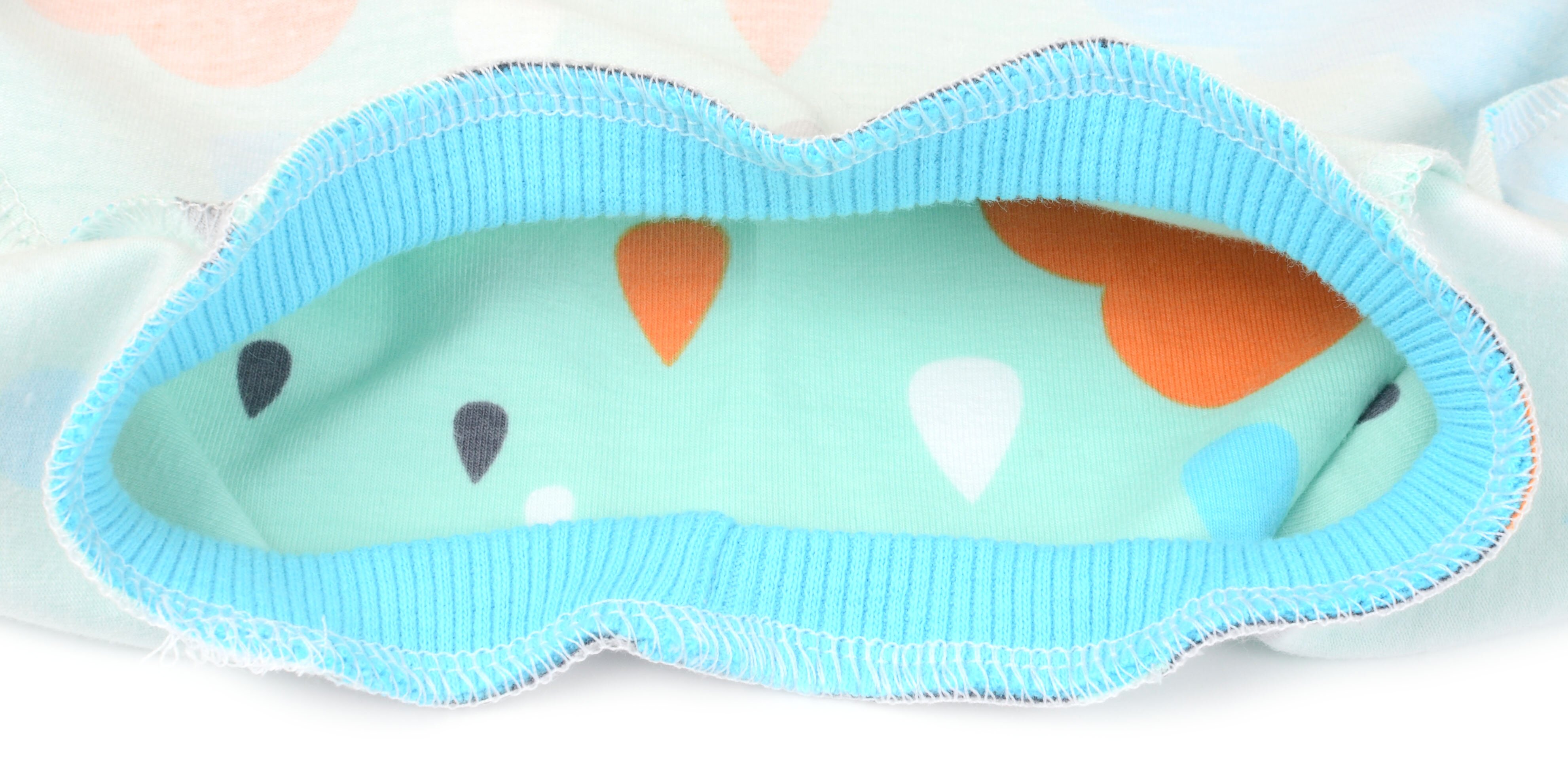 After the neckband, the bottom hem is folded inside 3/4″ and sewn across the top with a zig-zag stitch. And the side seam is sewn to the wrist to secure it.