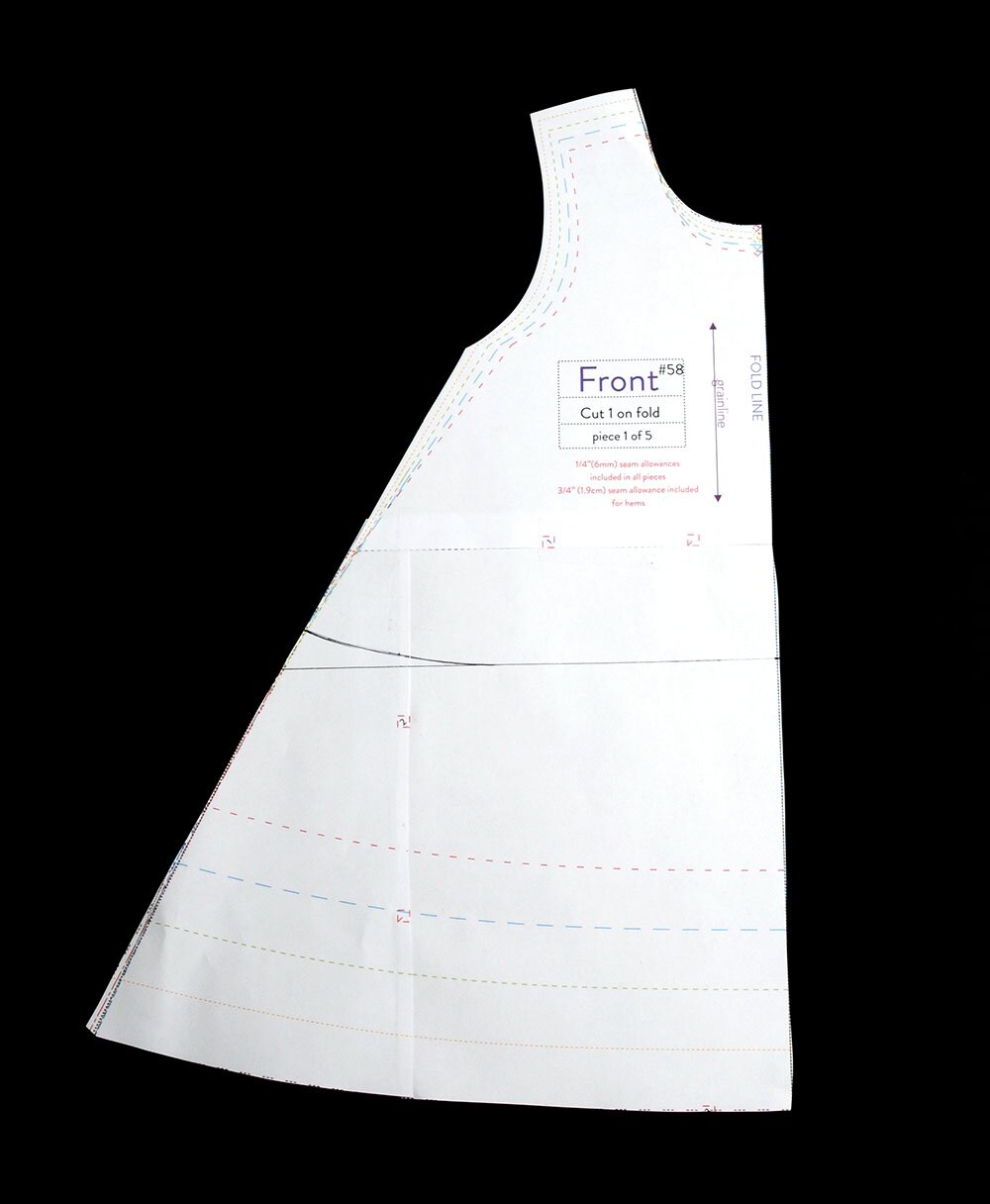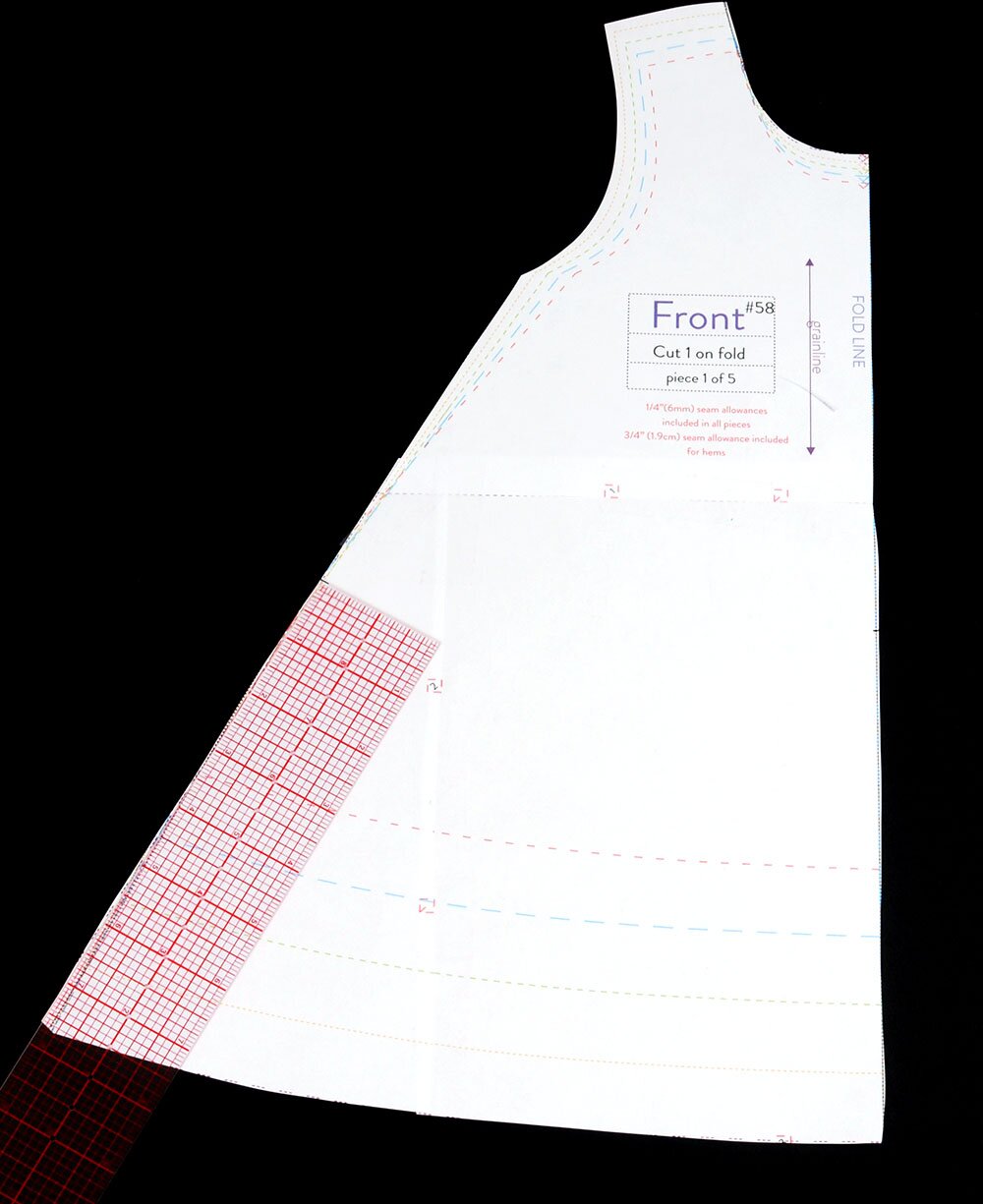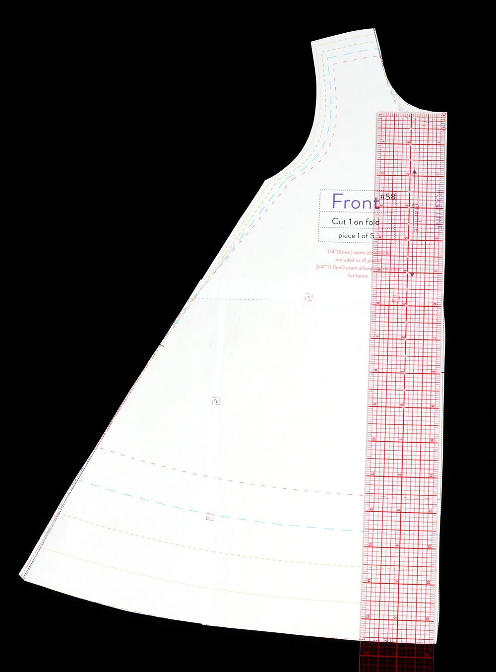 Start by taking the front pattern piece of the dress and measuring about half way between the neck and hem.