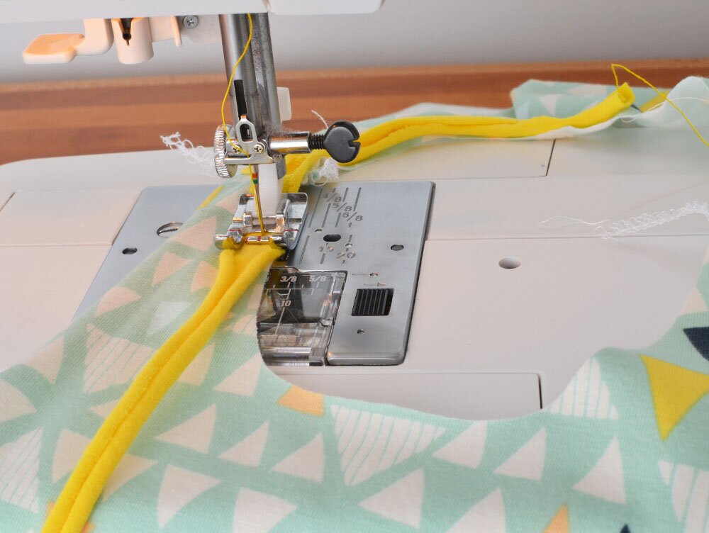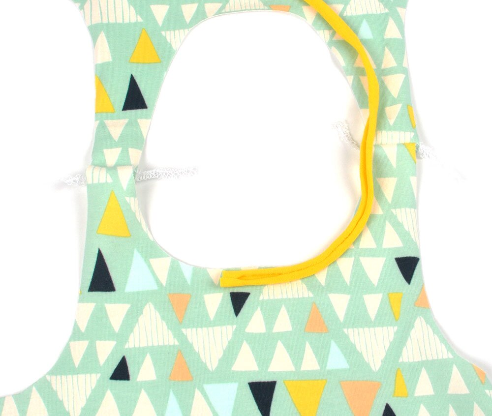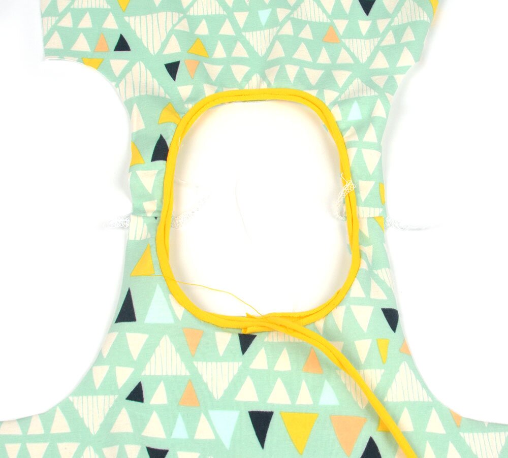 : You’ll lay the binding at the back neck to start. Then, zig-zag on top, in the middle. Overlap at the back and trim extra binding and threads.