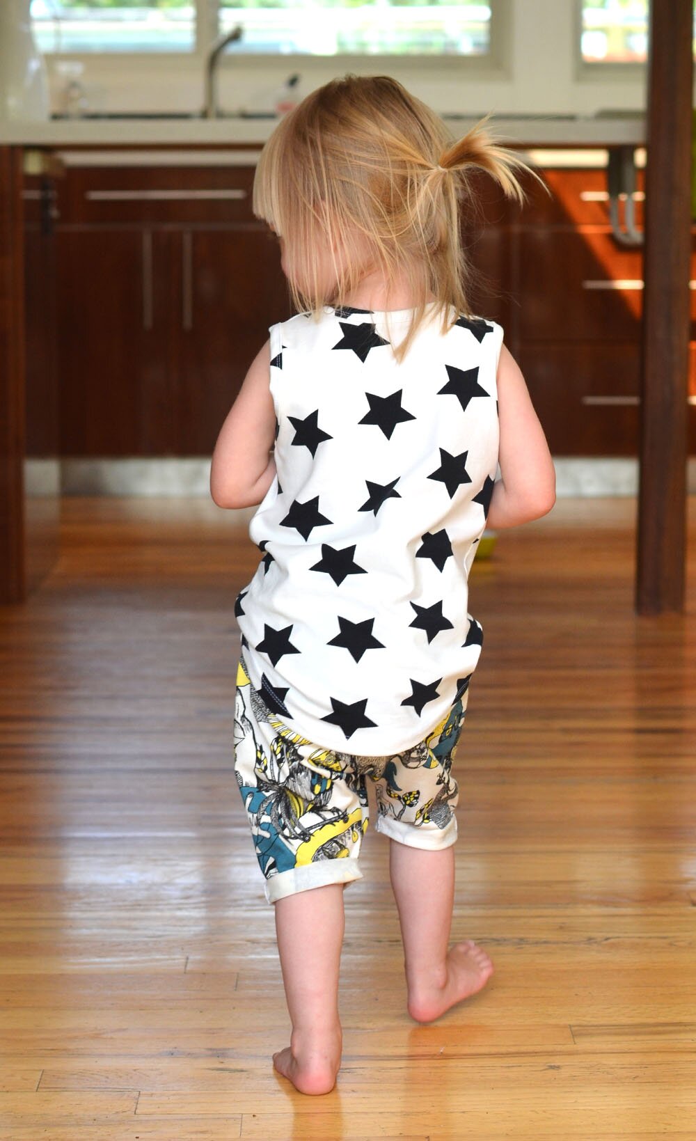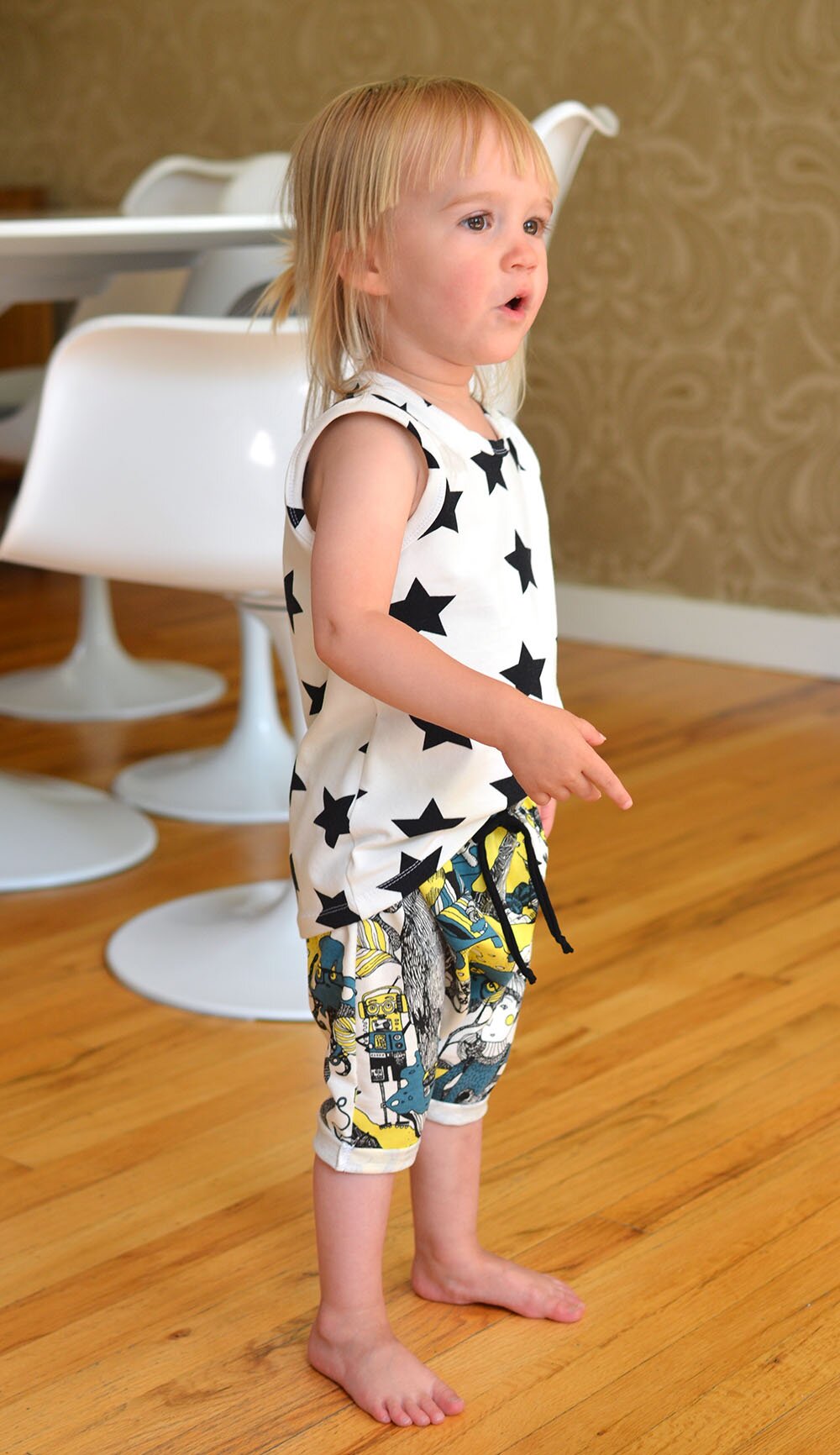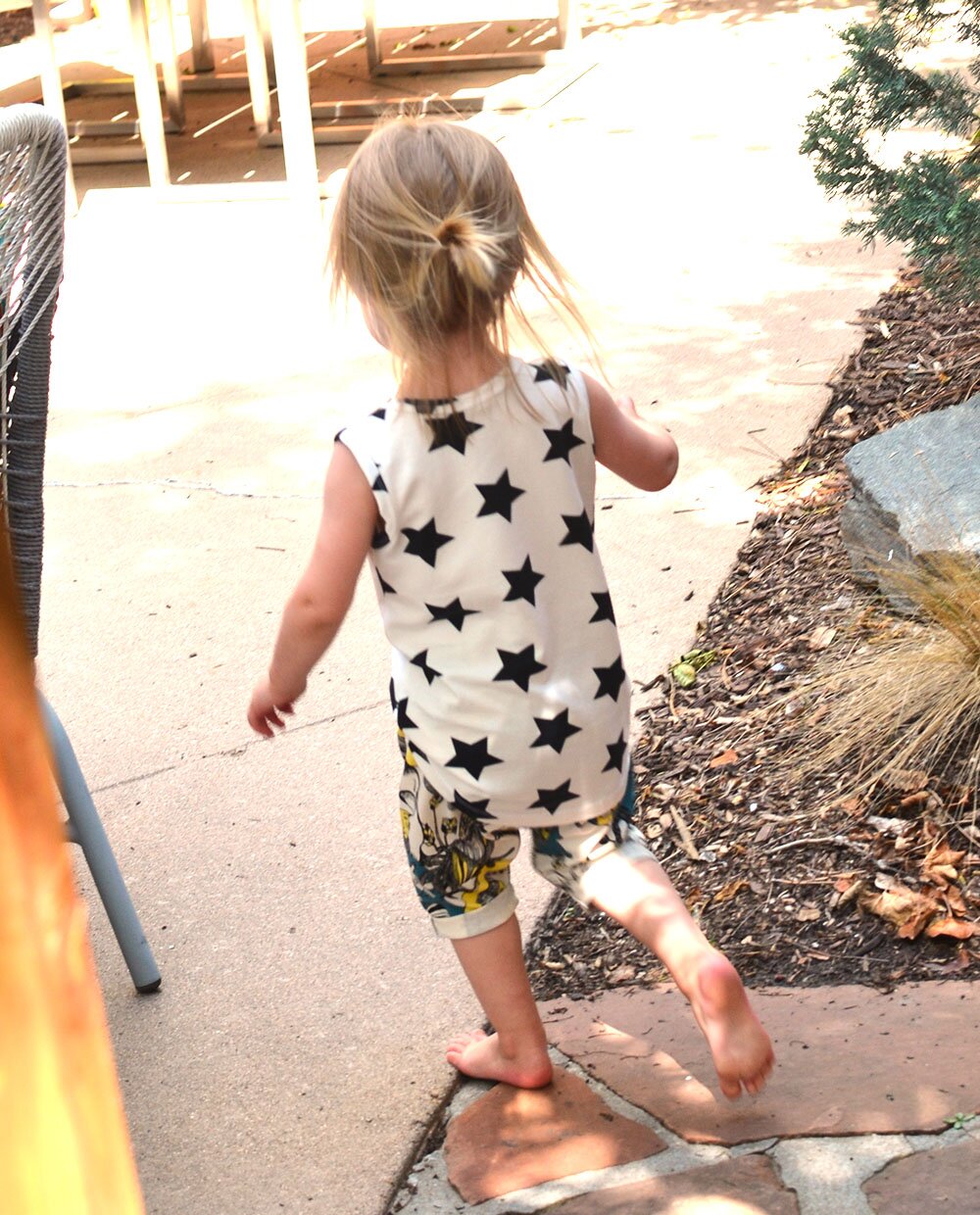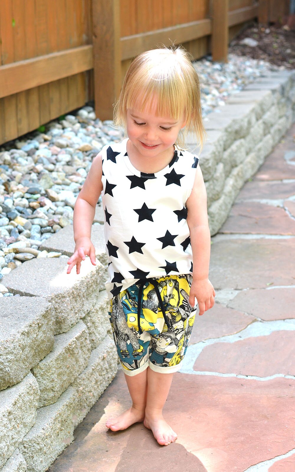 It’s been heating up around here and I quickly noticed E was lacking in the tank and shorts category. I made the harem shorts for her with a tank top to go with them. Click the pics below to see the patterns.