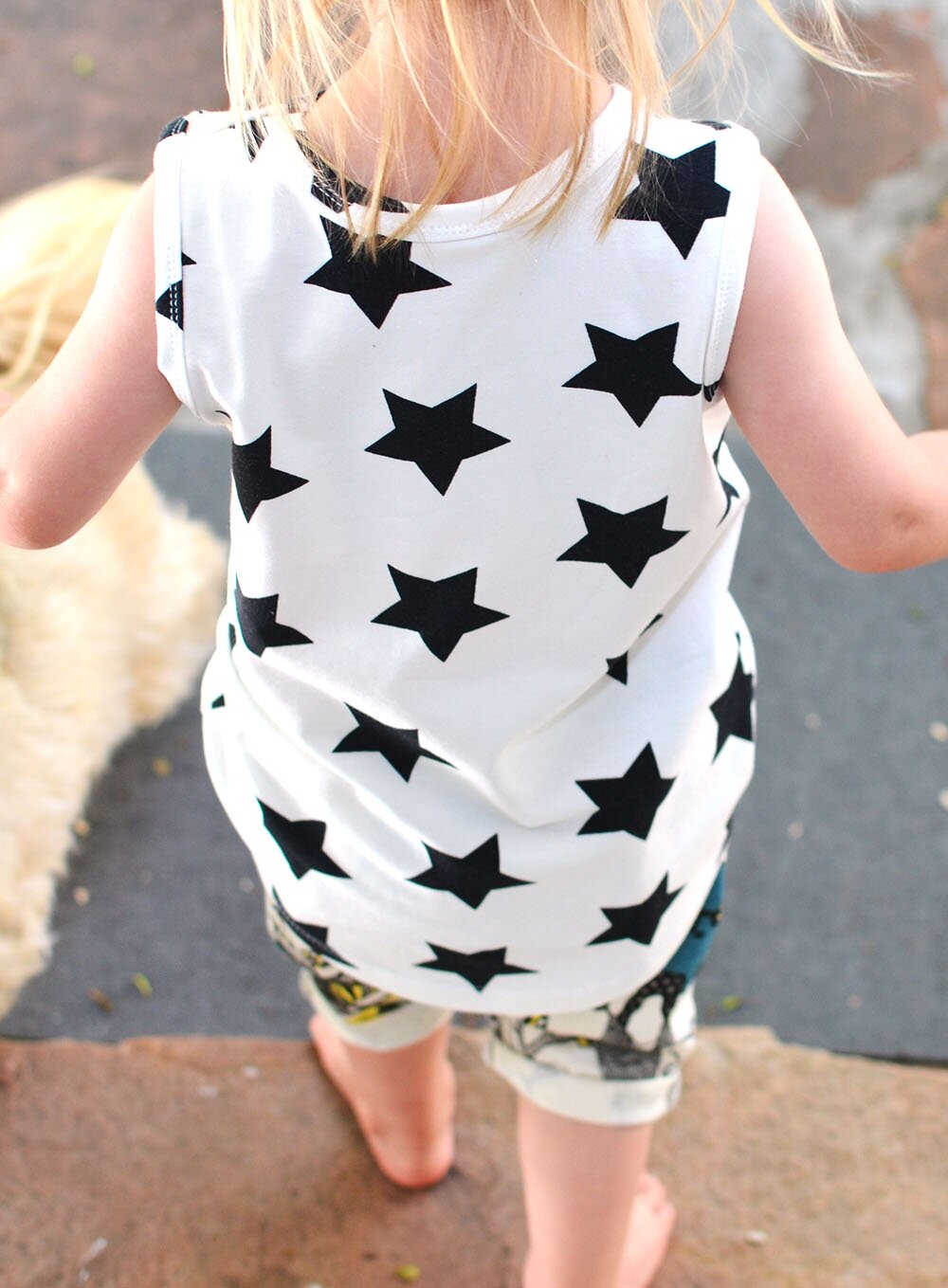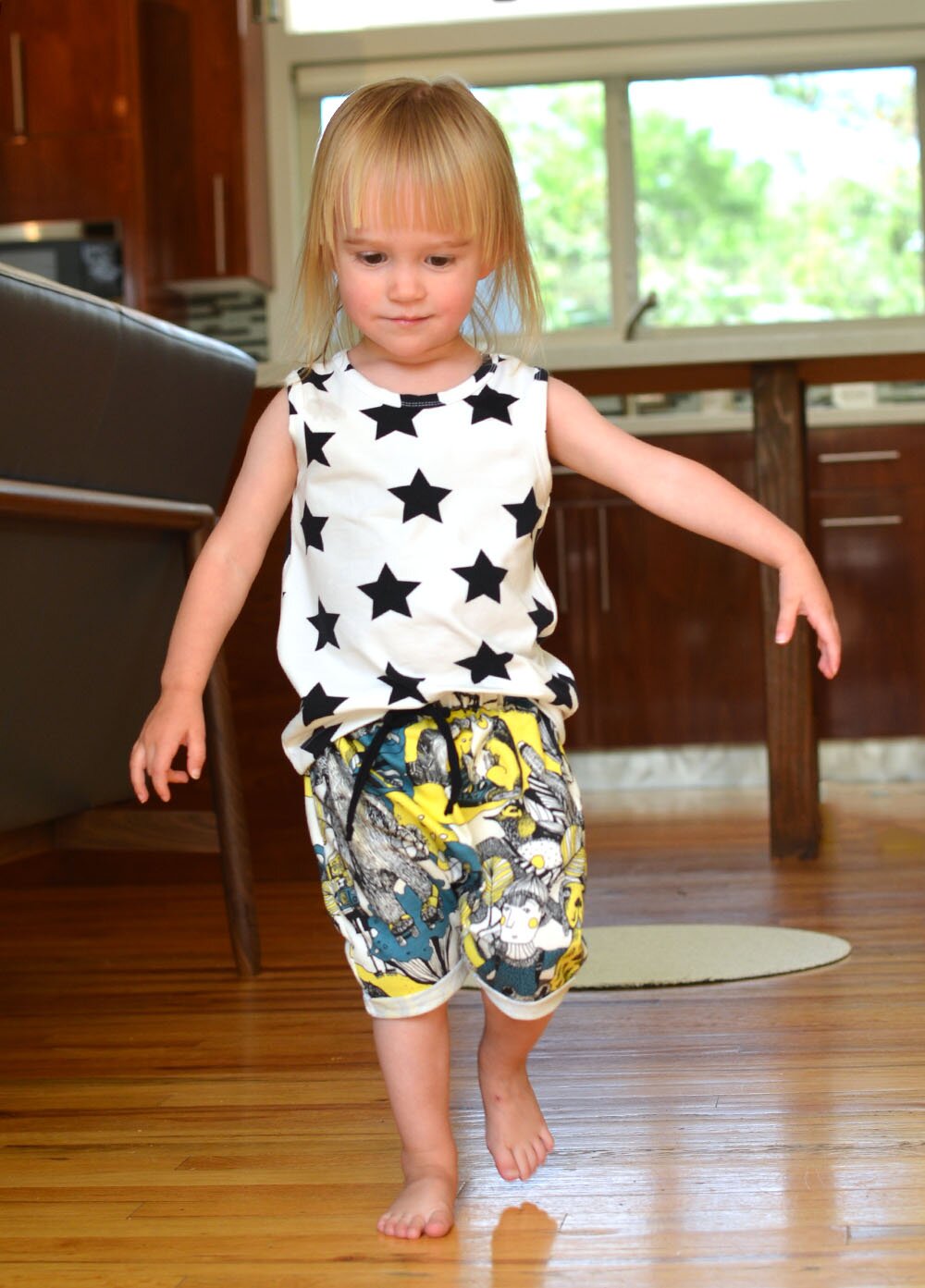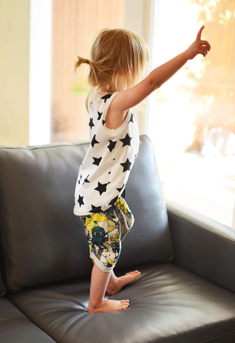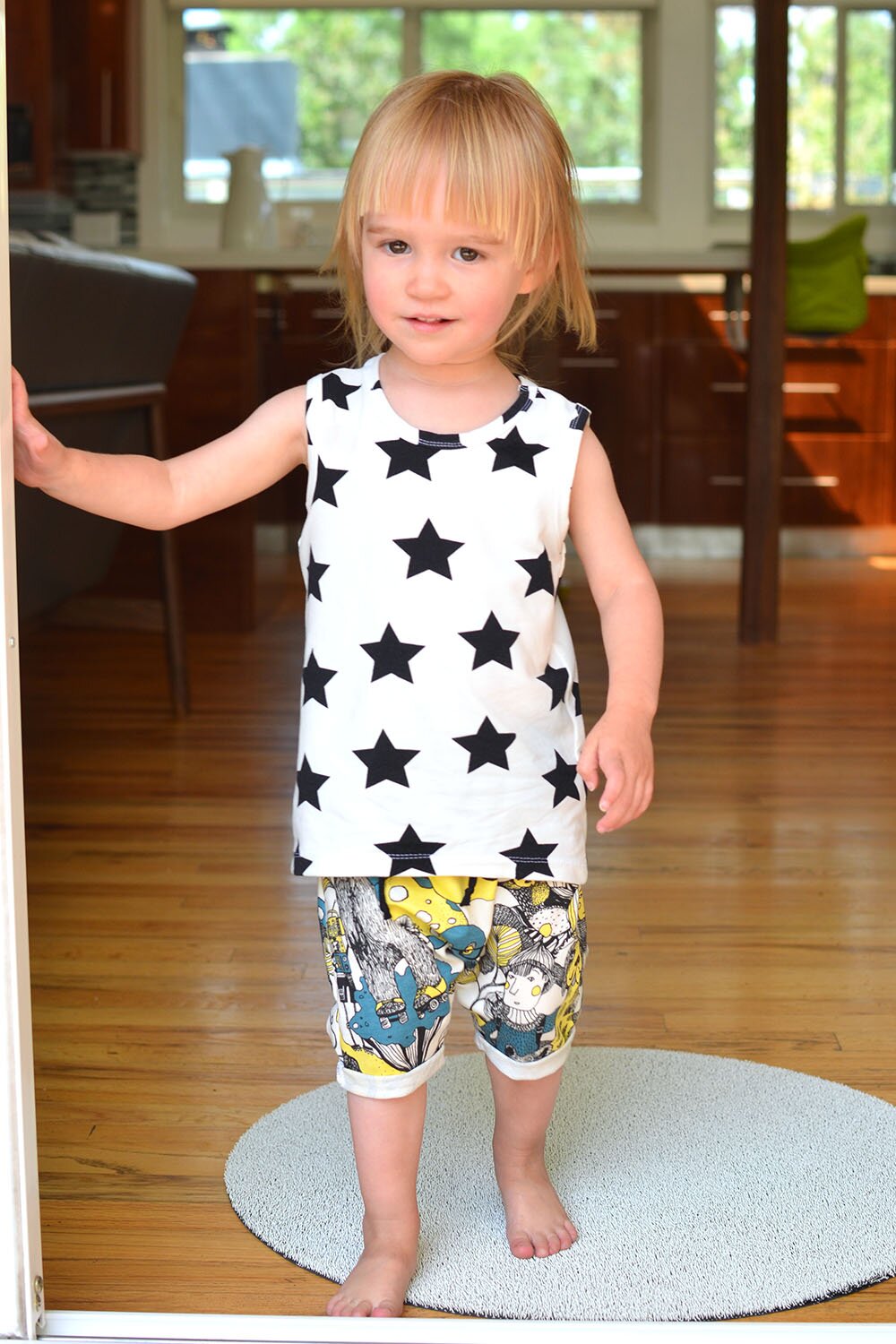 It’s been heating up around here and I quickly noticed E was lacking in the tank and shorts category. I made the harem shorts for her with a tank top to go with them. Click the pics below to see the patterns.