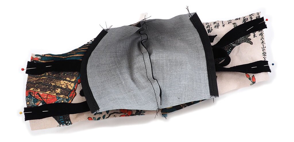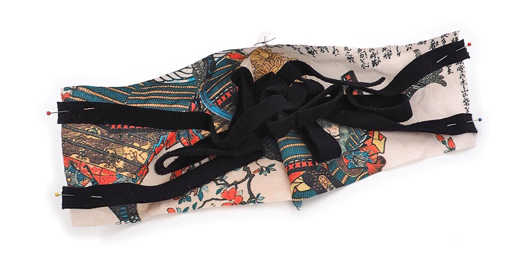 Do the same with the opposite cheek piece. Pin all together so the raw edges are even and the loops or ties are pinned in place