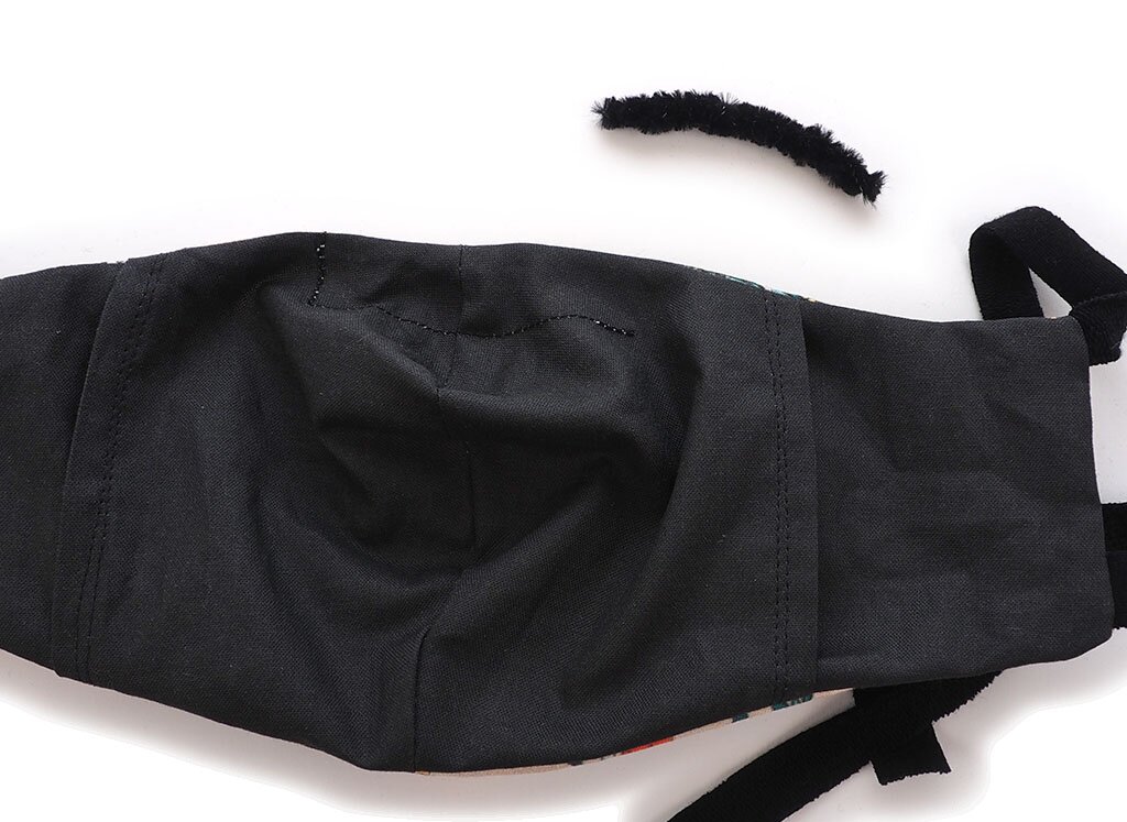 You can use whatever you can get your hands on for the metal piece. I used a triple layer pipe cleaner twisted together. Insert it into the casing through the filter layer inside the mask. I will leave this open so I can take it out to wash the mask. You may be more concerned for kids and enclose it. It depends what you think is safest for the age of the child!